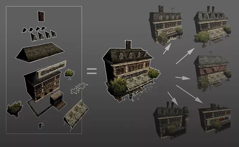 在编辑时,预制件流的额外代码支持随机处理等操作。对于特定部分,预制件流可以随机生成多个元素,并在这些元素上创建简单的变体。例如:房子和车子这类物品是从小型部件组成的,这些部件可以互相组合并匹配,从而在同样的对象上产生不同变体。